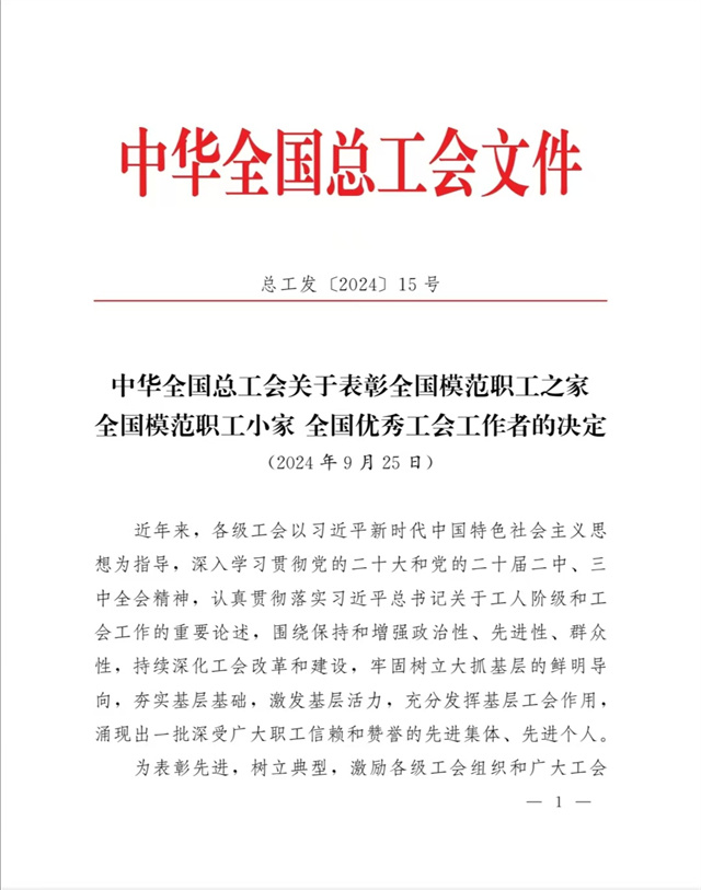 “全國模范職工之家”是中華全國總工會設立的授予全國工會系統(tǒng)先進集體的最高榮譽,是對基層工會工作的最高褒獎和肯定。公司工會在公司黨委領導下,以習近平新時代中國特色社會主義思想為指導,深入學習貫徹黨的二十大和黨的二十屆二中、三中全會精神,認真貫徹落實習近平總書記關于工人階級和工會工作的重要論述,牢固把握正確政治方向,充分發(fā)揮橋梁紐帶作用,切實維護職工合法權益,努力構建和諧勞動關系,不斷增強工會組織的引領力、組織力、服務力,為公司高質(zhì)量發(fā)展貢獻工會智慧和力量。